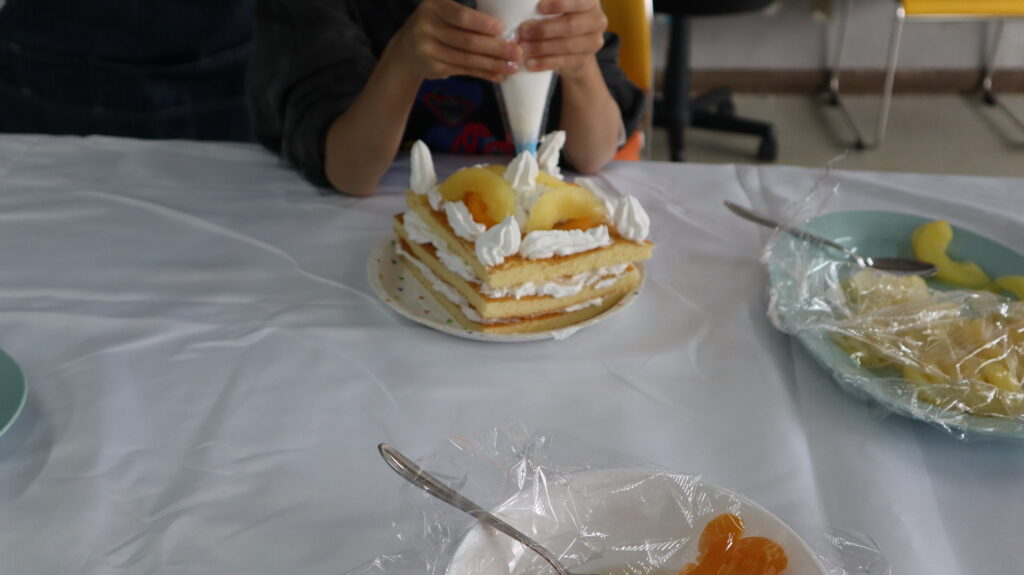 きょうだい児向けイベントで、きょうだい児が親御さんと一緒に、ケーキデコレーションに取り組む様子です。